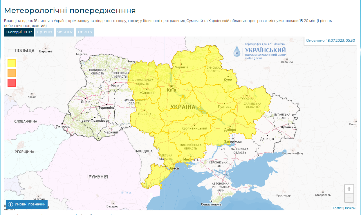 Утром и днем 18 июля в Украине, кроме запада и юго-востока, грозы; в большинстве центральных, Сумской и Харьковской областях при грозах местами шквалы 15-20 м/с (І уровень опасности, желтый), - говорится в сообщении.