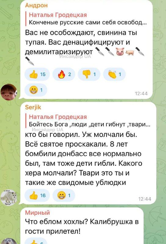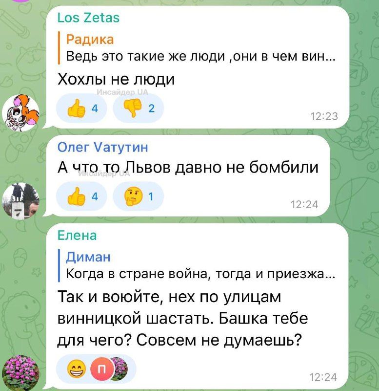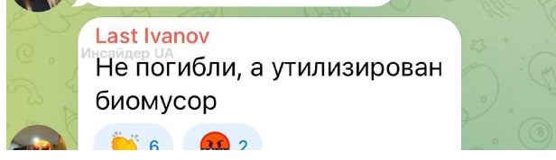 В российских пабликах можно найти море комментариев, где россияне, не военные, а мирные, пишут, что "так им и надо", "давно не бомбили", "не погибли, а утилизирован биомусор", "хохлы не люди".
