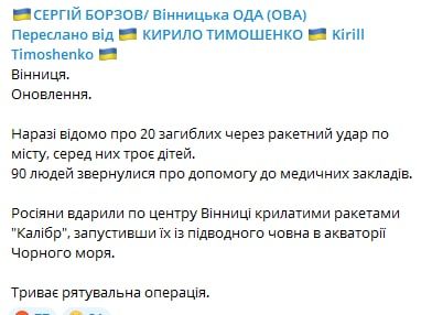 Сегодня, 14 июля, российские оккупанты нанесли ракетный удар по центру Винницы.
