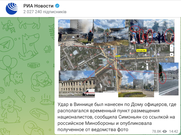Все очень просто: российская пропагандистская помойка "РиаНовости" со ссылкой на минобороны рф пишет, что "удар в Виннице был нанесен по Дому офицеров, где располагался временный пункт размещения националистов".
