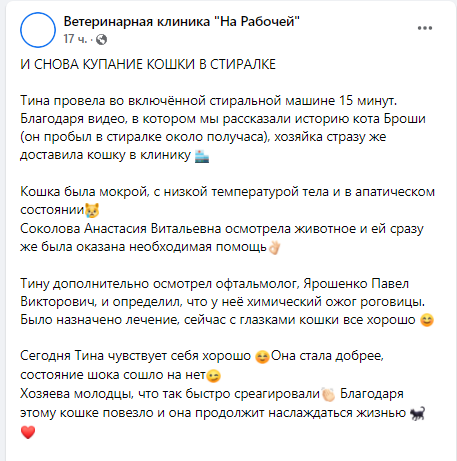 Мы уже писали, что в Днепре хозяева не заметили, что кот залез в барабан стиральной машины, и запустили процесс стирки. 30 минут пушистик пробыл в работающей машинке прежде, чем владельцы услышали его крик.