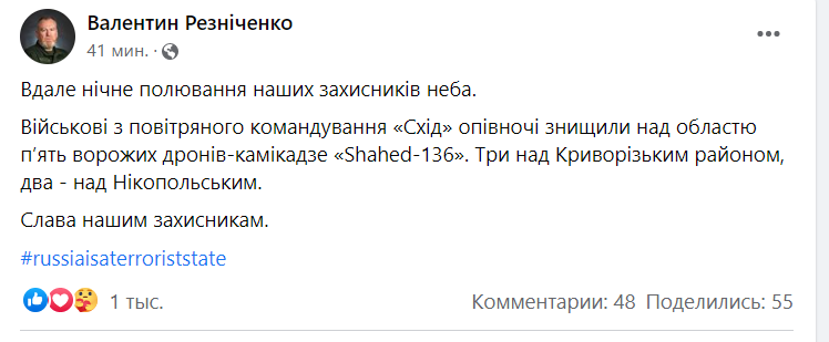 Удачная ночная охота наших защитников неба. Слава нашим защитникам, – отметил Валентин Резниченко.