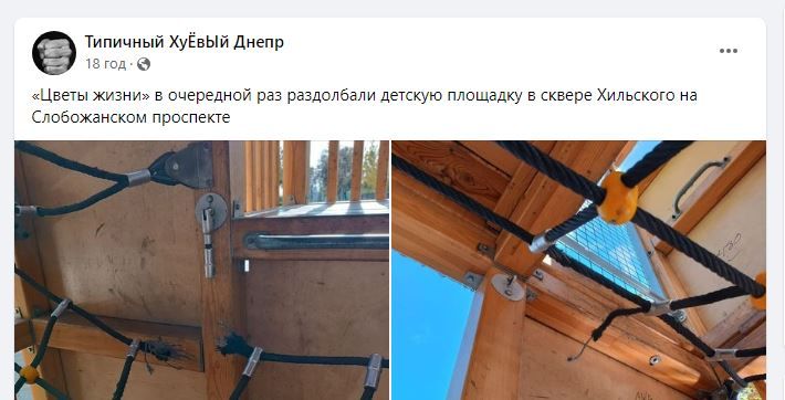 "Цветы жизни" раздолбали детскую площадку в сквере Хильского на Слобожанском проспекте, - пишут горожане.