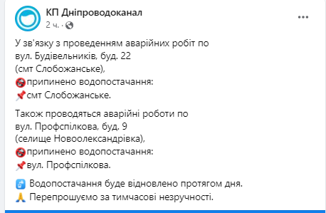 Также в связи с проведением аварийных работ по ул. Строителей, 22 (пгт Слобожанское) и ул. Профсоюзная, 9 (поселок Новоалександровка) прекращено водоснабжение: