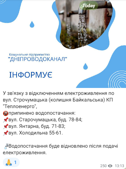 Обесточивание и аварийные работы: где сегодня в Днепре нет воды