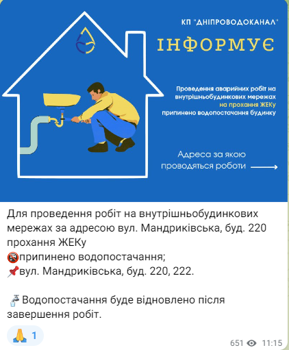 Кроме того, для проведения работ на внутридомовых сетях по ул. Мандрыковская, 220 прекращено водоснабжение: