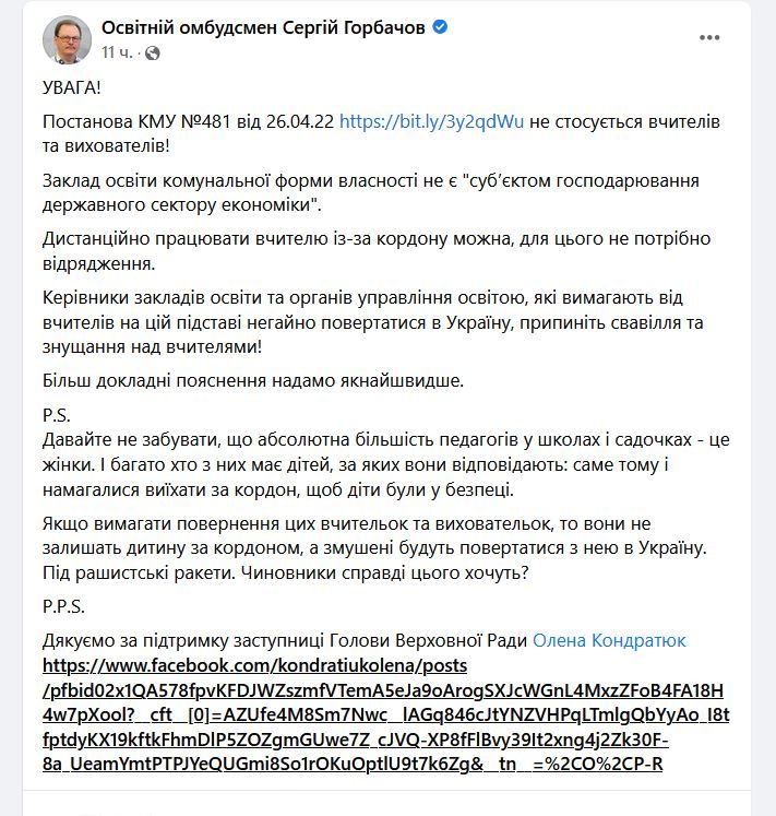 Как рассказывает образовательный омбудсмен Сергей Горбачев, это не касается учителей и воспитателей, которые уехали за границу. Об этом он сообщил на своей странице в Facebook.
