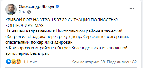 "Кривой Рог! На утро 15.07.2022 ситуация полностью контролируемая", - написал председатель военной администрации Кривого Рога.