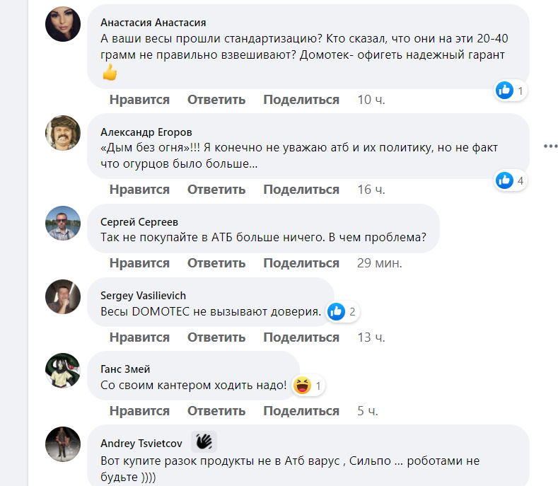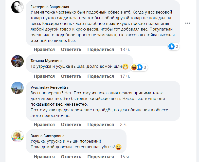 Пользователи отмечают, что необходимо следить за кассирами, что они случайно не положили на весы другой товар. Из-за этого вес продукта действительно может отличаться. Но в целом, в комментариях люди сомневаются в версии с обвесом и отмечают, что домашние весы могли и наврать. Плюс, в АТБ овощи взвешивают на кассе, поэтому продавцам нет особой выгоды с такого обмана. Разве что это секретная политика самой компании.
