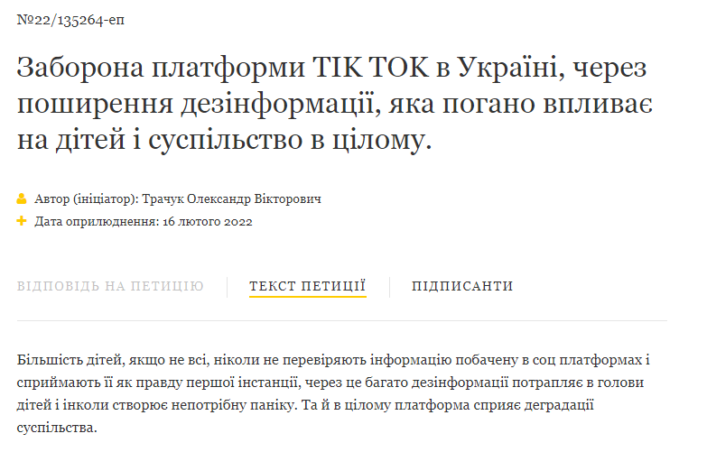 «Большинство детей, если не все, никогда не проверяют увиденную в социальных платформах информацию и воспринимают ее как правду первой инстанции, из-за этого много дезинформации попадает в головы детей, создается ненужная паника. Да и в целом платформа способствует деградации общества», - пишет автор петиции Александр Трачук.