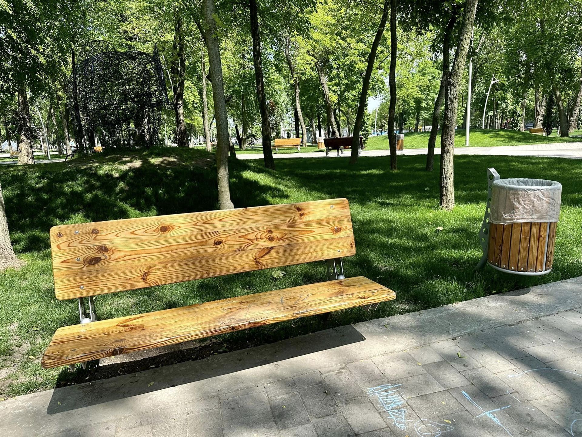 В парке очень много лавочек, есть зеленые тенистые аллеи, стоят мусорные баки. В центре парка в качестве арт-объектов можно увидеть несколько блестящих кубов. Тут также много лавочек и установлены современные фонари.