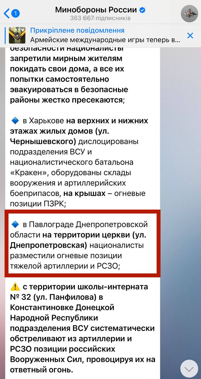 Так, по данным минобороны россии, на территории церкви в Павлограде «националисты разместили огневые позиции тяжелой артиллерии и РСЗО».
