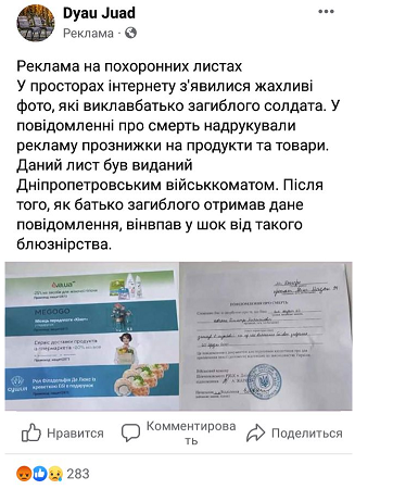 Так, одно из Фейсбук-сообществ пишет, что житель Днепропетровщины получил «оповещение о смерти своего сына» на рекламном буклете.