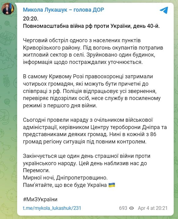 Очередной обстрел Криворожского района, - Лукашук о ситуации на 4 апреля