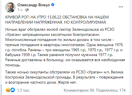 О том, как прошла ночь и какая ситуация в Криворожском районе на утро 13 июня, сообщил председатель военной администрации Кривого Рога Александр Вилкул.