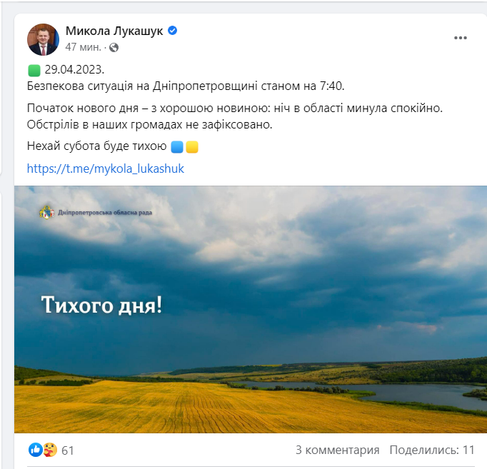 Начало нового дня – с хорошей новостью: ночь в области прошла спокойно. Обстрелы в наших громадах не зафиксированы. Пусть суббота будет тихой, – написал он.