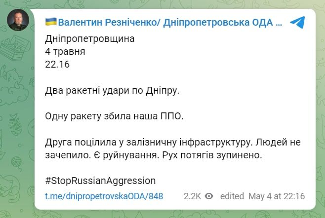 Одну ракету сбила наша ПВО, – Резниченко о ракетных ударах по Днепру
