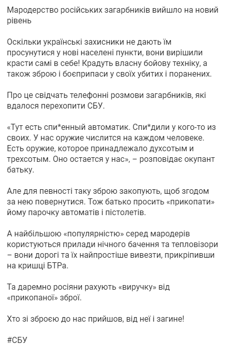 Служба безопасности Украины перехватила разговор оккупанта, где он заявляет, что похищают собственную боевую технику.