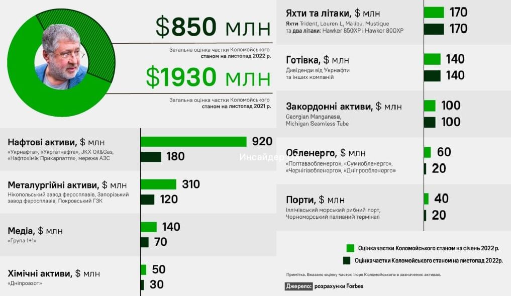 Кроме того, другая основа бизнеса группы "Приват" в виде металлургических активов (Никопольский и Запорожский ферросплавные заводы) обесценилась вдвое, с 310 млн долл до 120 млн долл. Медиа активы, представленные долей Коломойского в "Группе 1+1", также обесценились вдвое, до 70 млн долларов. Завод "Днепразот", производящий азотные удобрения, упал в оценке с 50 млн долларов до 30 млн долларов. Также к сокращению состояния бизнесмена добавилось падение стоимости активов в энергетике ("Полтаваоблэнерго", "Сумыоблэнерго", "Черниговоблэнерго" и "Днепрооблэнерго") - с 60 до 20 млн долл. Доли в Ильичевском морском рыбном порту и Черноморском топливном терминале вдвое обесценились до 20 млн долл.