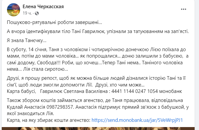 Как пишет в ФБ днепрянка Елена Черкасская, вчера удалось идентифицировать тело Татьяны Гаврилюк. Ее опознали по татуировке на запястье.
