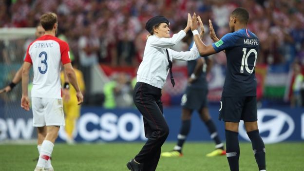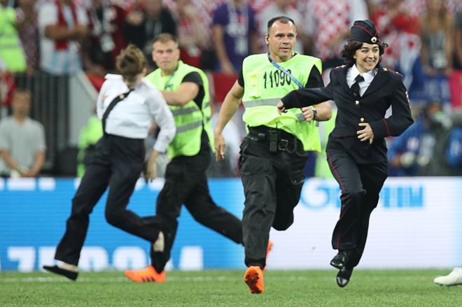 Среди курьезов финала стоит отметить выбегание на поле во втором тайме четверых людей в форме полиции. Это оказались участники арт-группы «Pussy Riot», устроившие акцию «Милиционер вступает в игру». Так они потребовали освобождения политзаключенных, а также людей, арестованных на митингах и за посты в соцсетях, сообщает bbc.com.