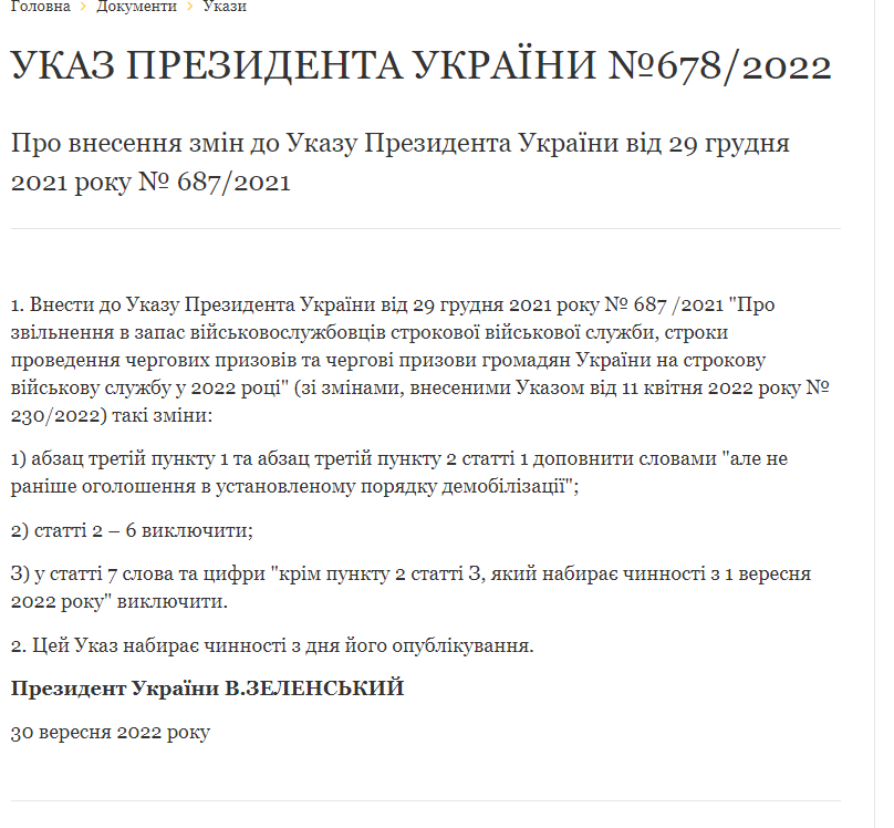 Президент внес изменения в указ №687/2021 "Об увольнении в запас военнослужащих срочной воинской службы, сроках проведения очередных призывов и очередных призывах граждан Украины на срочную военную службу в 2022 году".