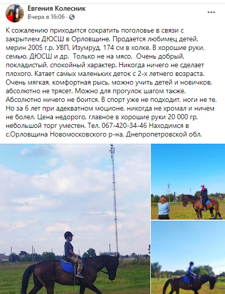 Об этом на своей страничке в Facebook рассказала тренер по конному спорту Евгения Колесник.