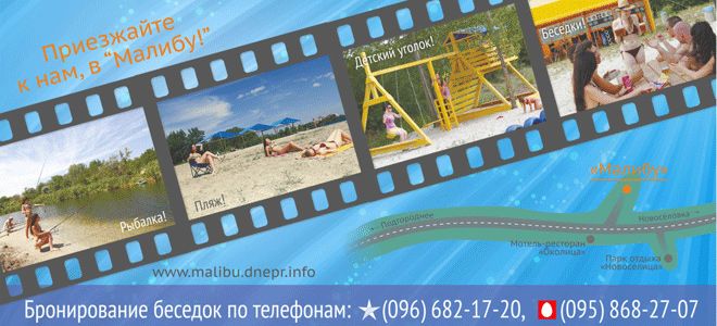В 12 км от Днепра находится очаровательный остров для отдыха «Малибу». Прекрасный песчаный пляж, великолепная природа, чистая и прохладная река – отличная альтернатива жаркому мегаполису. Такой островок понравится любителям поплавать и порыбачить, приготовить вкусный шашлык и прекрасно провести время с семьей или друзьями.