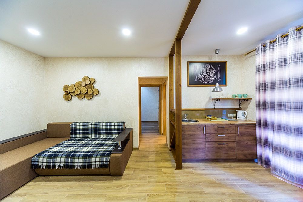 Двухместный номер с одной двуспальной кроватью и балконом обойдется в 1150 грн. А двухместный номер с кухней можно снять за 1200 грн.