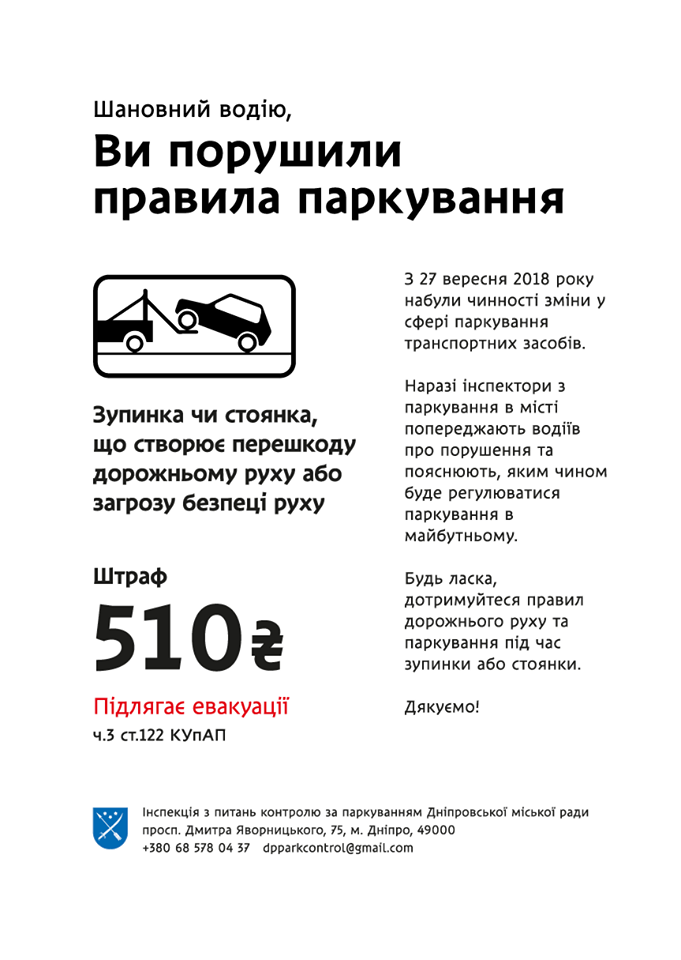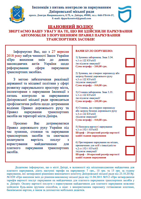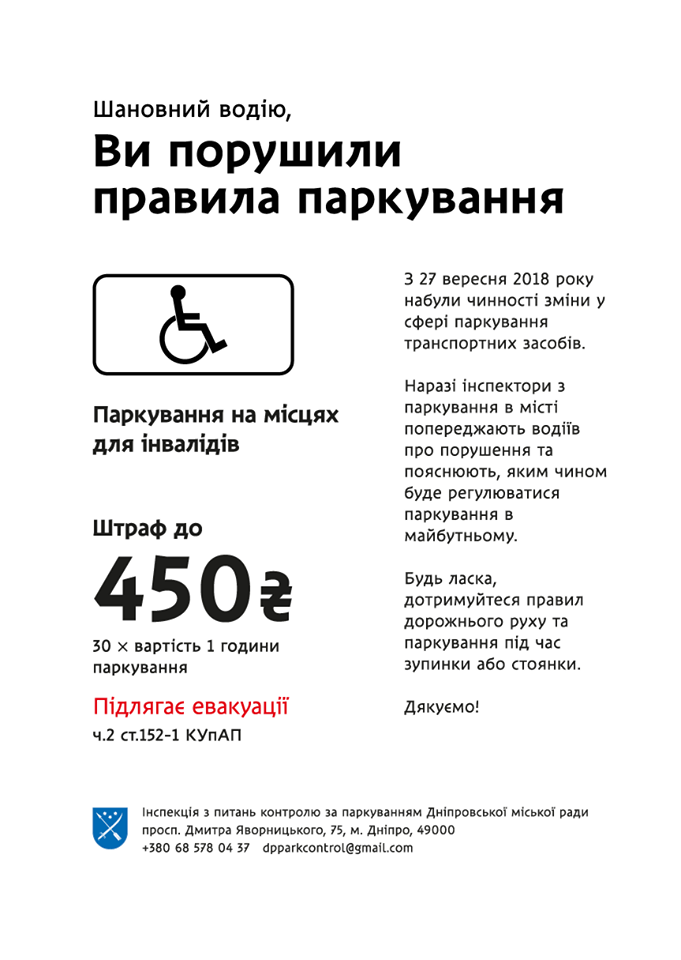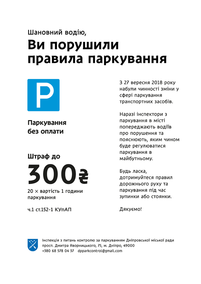 Тем не менее, Инспекция по вопросам контроля за паркованием при Днепровском горсовете решила начать с предупреждения. Именно для этого были разработаны специальные листовки, которые водители, нарушившие правила паркования, будут замечать под дворниками автомобилей.,