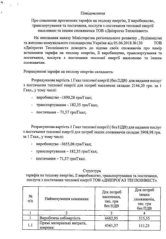 Для других потребителей расчетная стоимость 1 Гкал тепловой энергии (без НДС) для предоставления услуг по поставке тепловой энергии составляет 3 908,98 гривен, в том числе:
