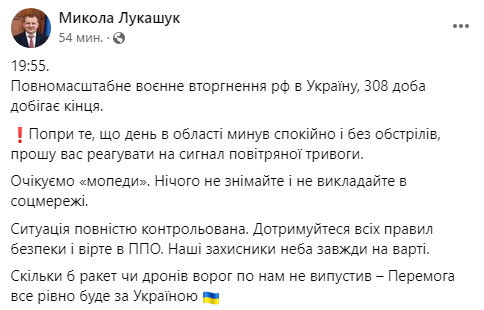 “Несмотря на то, что день в области прошел спокойно и без обстрелов, прошу вас реагировать на сигнал воздушной тревоги. Ожидаем «мопеды». Ничего не снимайте и не выкладывайте в соцсети. Ситуация полностью контролируется. Соблюдайте все правила безопасности и верьте в ПВО. Наши защитники неба всегда стоят. Сколько бы ракет или дронов враг по нам не выпустил – Победа все равно будет за Украиной”, – написал Николай Лукашук.