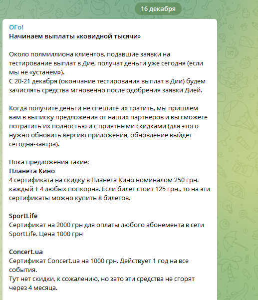 Об этом также сообщил в своем телеграм-канале один из основателей Монобанка Олег Гороховский. Пока тысячу получат только клиенты этого банка, которые записались на тестирование функции в Дії. А уже с 20 декабря их начнут выплачивать всем, как только человек подаст заявку и ее одобрят в приложении.