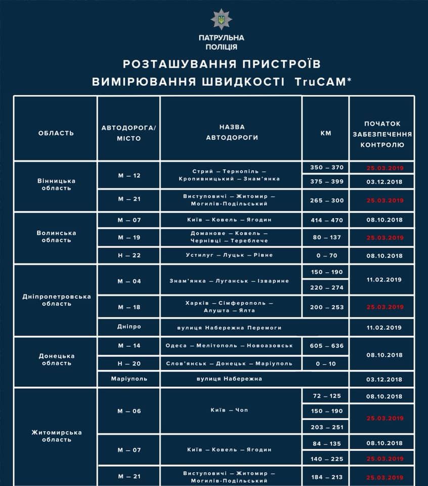 Полицейский сообщил, что с понедельника, 25 марта, в Украине начнут работать еще 25 новых приборов TruCAM. Установлены они будут в разных областях Украины, в том числе и в Днепропетровской. Всего с понедельника в Украине будет работать 75 данных приборов.