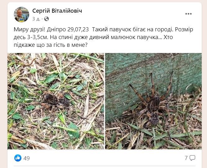 Мира друзья! Днепр 29 июля. Такой паучок бегает по огороду. Размер где-то 3-3,5см. На спине очень странный рисунок паучка... Кто подскажет, что за гость у меня? – пишет Сергей