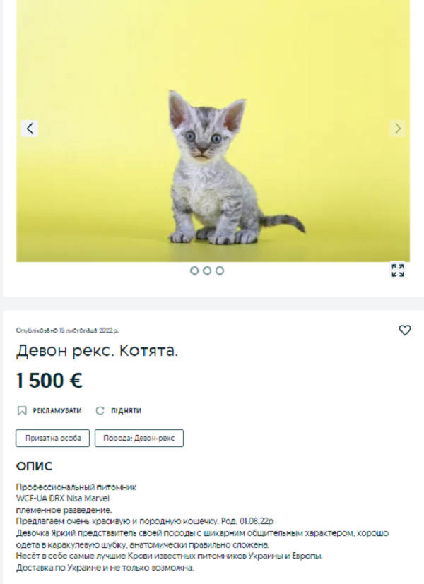 56,3 тыс грн хотят за котенка породы девон-рекс. Котенку исполнилось чуть больше 3-х месяцев, но заводчик пишет, что усатый – яркий представитель своей породы, имеет общительный характер, густую шерсть, а ее родители родились в известных питомниках Украины и Европы.