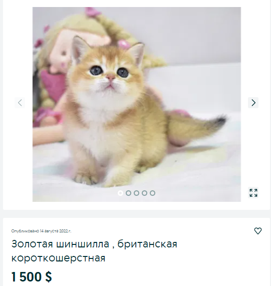 Чуть дешевле, 55,4 тыс грн обойдется кошка породы «британская короткошерстная». Из-за маленького возраста у нее пока еще нет всех необходимых прививок, поэтому в новый дом ее отпустят только после полной вакцинации. Продавец особо отмечает, что шерсть у кошечки золотого оттенка, что очень ценится в данной породе.