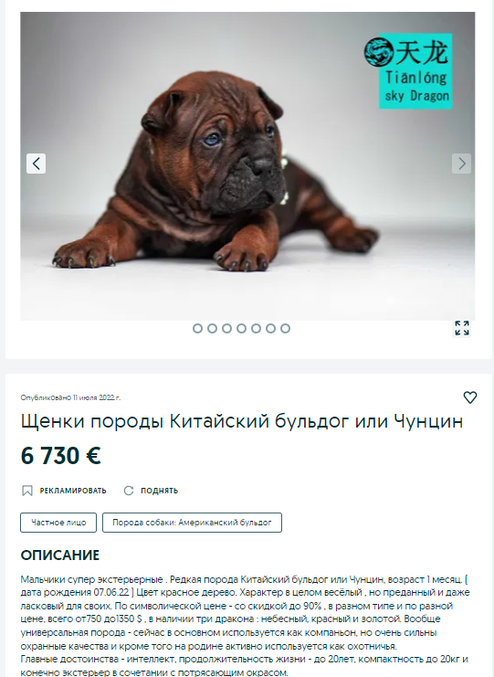 Собаку породи китайський бульдог або Чунцин можна придбати за 203 тис грн, та власники ладни розпродати місячну малечу зі скидкою до 90%, тобто лише десь за 45-50 тис грн. Це дуже рідкісна для території України порода. У себе на батьківщини бульдоги використовуються як собаки для полювання, в нас – як компаньйони, але можуть бути і охоронцями. Китайський бульдог живе до 20 років.
