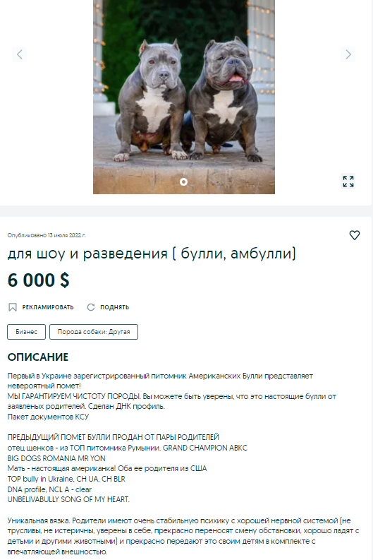 Трохи дешевше, 177 тис грн коштує щеня американського булі. Продавець клянеться, що гарантує чистоту породи, кожній собаці зроблений ДНК –профіль. Батьки цуценят мають стабільну нервову систему, спокійні, добре ладнають з дітьми, вважається, що ї діти, яких нині продають, такі самі. Коли підросте щеня – можна буде возити його на різноманітні виставки.