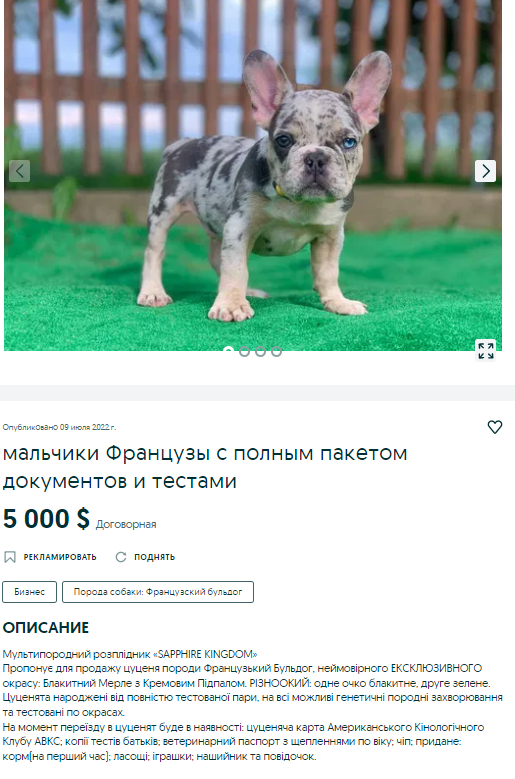 148 тис грн обійдеться собака породи французький бульдог. Така висока ціна через окрас шерсті тваринки, називається він «блакитний мерле з кремовим підпалом» та ще й на додачу цуценя різнооке, одне око у нього блакитне, інше – зелене. При передачі покупцеві у щеня буде щеплення по віку, чіп, корм, ласощі, іграшки, нашийник та повідок, карта Американського кінологічного клубу АВС, копії тестів батьків на стан здоров’я.