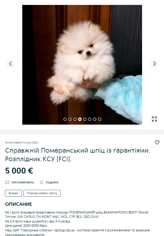 За 151 тис грн можна придбати «справжнього померанського шпіца з гарантіями». Всі щенята мають велику перспективу для відвідування виставок. У них все добре зі здоров’ям, немає ніяких дефектів, а є всі документи від КСУ.
