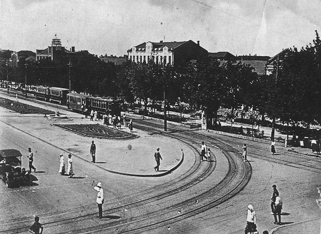 На фото можно увидеть, что там, где сегодня стоит два ряда машин были трамвайные рельсы. Часть их сохранилась до сих пор – по ним проезжает трамвай маршрута №1 в оба направления.