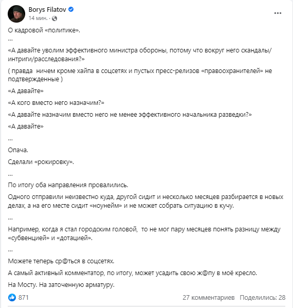 О кадровой «политике». «А давайте уволим эффективного министра обороны, потому что вокруг него скандалы/интриги/расследования?» (правда ничем, кроме хайпа в соцсетях и пустых пресс-релизов «правоохранителей», не подтвержденные) «А давайте». «А кого вместо него назначим?» «А давайте назначим вместо него не менее эффективного начальника разведки?» «А давайте». Опача. Сделали «рокировку». По итогу оба направления провалились. Одного отправили неизвестно куда, другой сидит и несколько месяцев разбирается в новых делах, а на его месте сидит «ноунейм» и не может собрать ситуацию в кучу. Например, когда я стал городским головой, то не мог пару месяцев понять разницу между «субвенцией» и «дотацией». Можете теперь ср@ться в соцсетях. А самый активный комментатор, по итогу, может усадить свою ж@пу в моё кресло. На Мосту. На заточенную арматуру, - написал мэр Днепра.