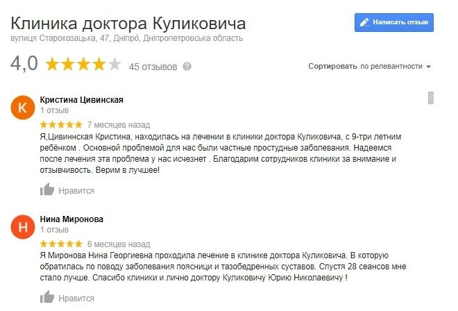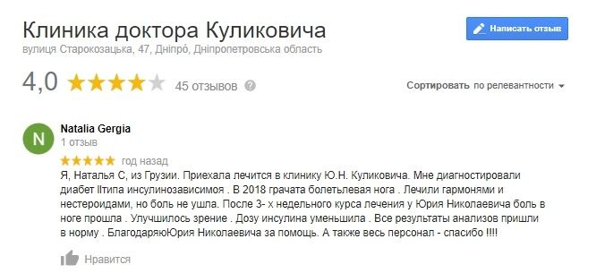 Судя по отзывам, лечение гомеопатией в клинике было поставлено на поток. 11 марта 2017 года некая Потоскуева Н.В. написала, что «лечилась гомеопатией» и встала на ноги, а вслед за ней пациентка Молоток Т.Я. в тот же день оставила еще один отзыв о прекрасном лечении гомеопатией.