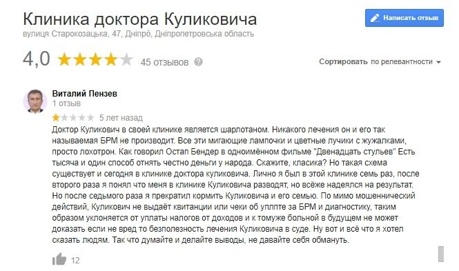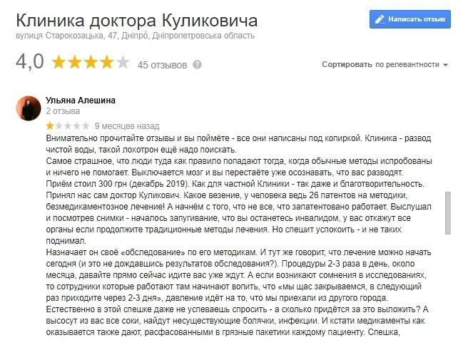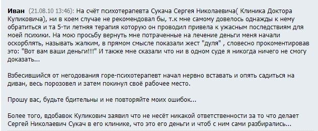 Понятно, почему ни один уважающий себя врач с практикой не направит пациента в клинику доктора Куликовича. Ну а если у вас есть много времени и денег, то можно самостоятельно развлечься вылечиванием ушиба пятки или насморка правой лопатки - эффект будет тот же, если не лучше. К тому же сэкономленные деньги вы сможете потратить на визит к действительно квалифицированным врачам, а не к жуликам и шарлатанам.