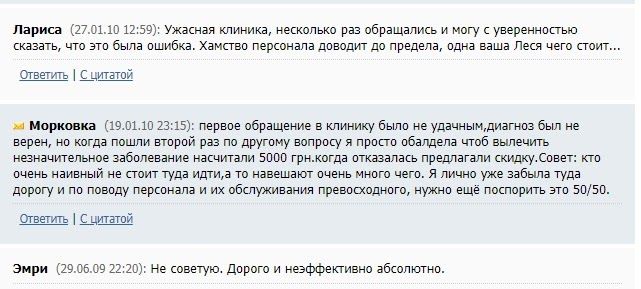 Положительные отзывы написаны сотрудниками фирмы как под копирку: «Я, ФИО, лечила в клинике болячку. Все вылечили. Спасибо».