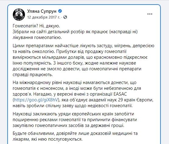 Бывший министр здравоохранения Ульяна Супрун, которую можно упрекать в разных вещах, но не в том, что она проповедовала бездоказательную медицину, приводила факты: ни одно научное исследование не смогло доказать, что гомеопатические препараты действительно работают.