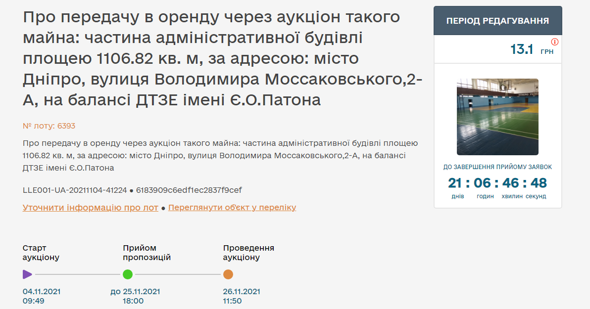 В Днепре на ProZorro.Sale выставили на аукцион спортзал Днепровского техникума сварки и электроники имени Патона. Помещение сдают в аренду на 5 лет. Начальную цену поставили 13 гривен. Торги проводят за английской схемой, то есть выставляют начальную цену, которую потом постепенно поднимают участники и выигрывает тот, кто предложит наибольшую сумму.