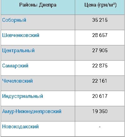 Далее следуют Самарский район – 22 875 грн. за квадратный метр и Чечеловский район со стоимостью 22 161 грн. за «квадрат». Средняя цена в Индустриальном районе составляет 20 617 грн. за кв. м. Амур-Нижнеднепровский район стал последним в списке, здесь средняя цена составляет 19 350 грн. за квадратный метр.