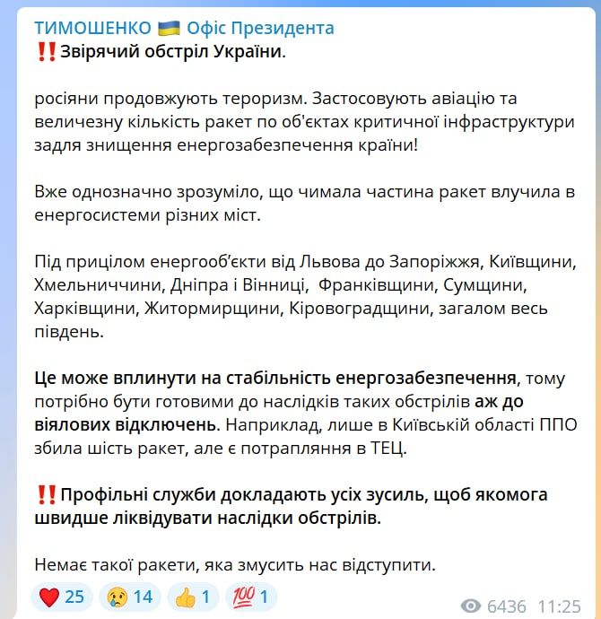 Замруководителя ОП Кирилл Тимошенко сообщил, что под прицелом российских ракет энергетическая инфраструктура Украины. Предварительно уже известно, что есть попадание в одну из Киевских ТЭЦ.